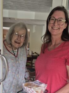 Another unexpected bonus of the Meals on Wheels Program for Janet has been developing friendships with the drivers, just one of the ways this service has helped her spend her days at home when her family isn’t with her. Janet has had a number of volunteer delivery drivers, currently a different one each day of the week. “I know them all by name,” notes Janet, and she enjoys chatting with all of them – one is an identical twin just like two of her great grandchildren – but she really loves it when she makes a deeper connection. That happened with her Friday driver, Paige, a fellow transplant from the south. The home-delivered meal that brought them together sparked conversations about shared Southern food traditions and their shared love of community service (Janet and Milt volunteered for the Natick Service Council for years). Before long, Janet and Paige were chatting at length during each delivery.